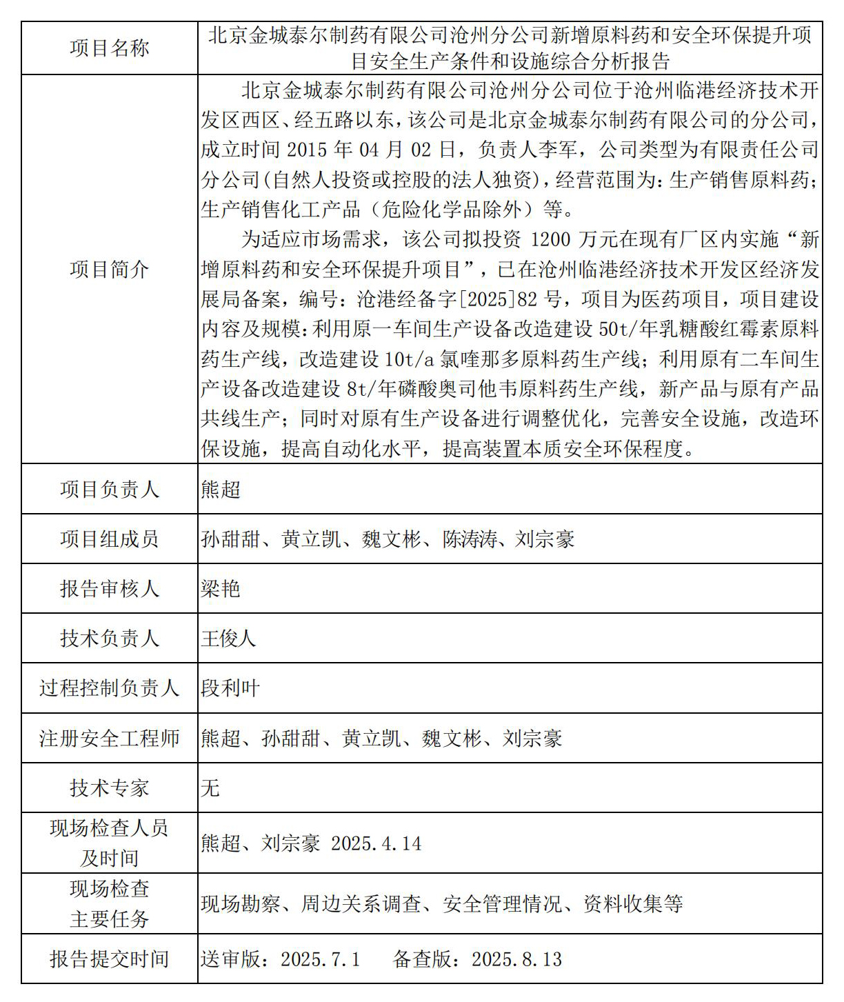 北京金城泰爾制藥有限公司滄州分公司新增原料藥和安全環(huán)保提升項(xiàng)目安全生產(chǎn)條件和設(shè)施綜合分析報(bào)告