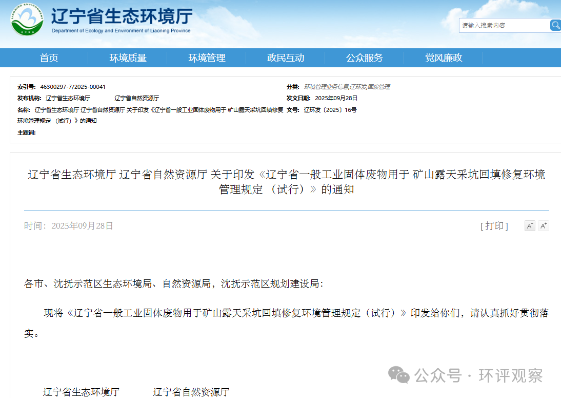 環(huán)境廳自然資源廳印發(fā)《一般工業(yè)固體廢物用于 礦山露天采坑回填修復(fù)環(huán)境管理規(guī)定 (試行)》