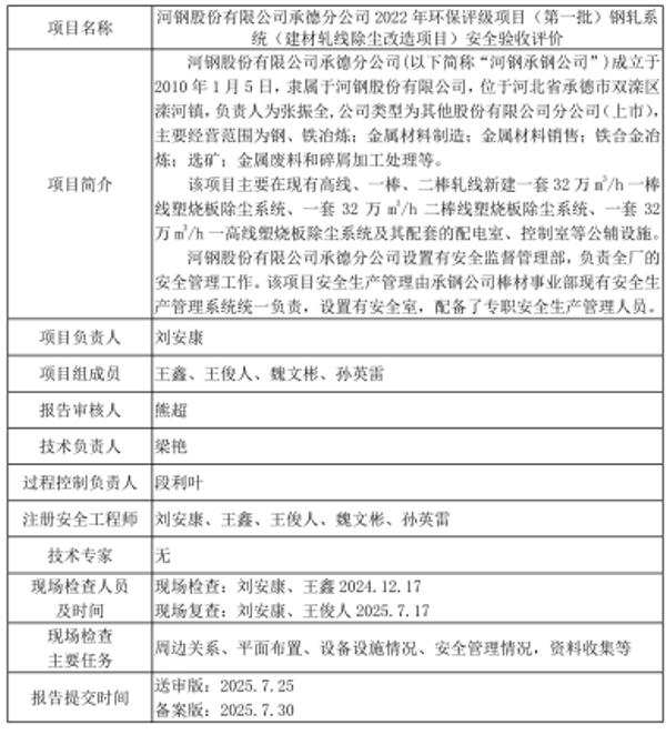 河鋼股份有限公司承德分公司2022年環(huán)保評級項(xiàng)目(第一批)鋼軋系統(tǒng)(建材軋線除塵改造項(xiàng)目)安全驗(yàn)收評價