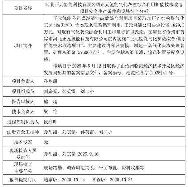 河北正元氫能科技有限公司正元氫能氣化灰渣綜合利用擴能技術改造項目安全生產條件和設施綜合分析